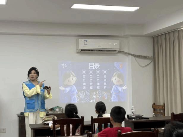 实践团成员配合动画短片与经典工艺品图片,将苗族蜡染的历史脉络、五道核心工序及其承载的民族记忆层层拆解,以寓教于乐的讲授方式,讲述了苗族蜡染的历史源流、工艺流程及文化价值,并通过双向互动充分调动学生参与热情,手工教学环节引导学生在愉悦氛围中沉浸式完成工艺品制作。